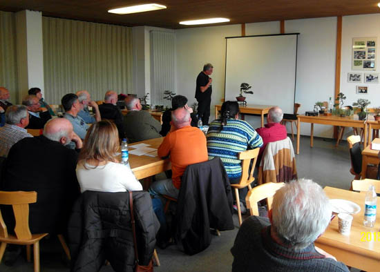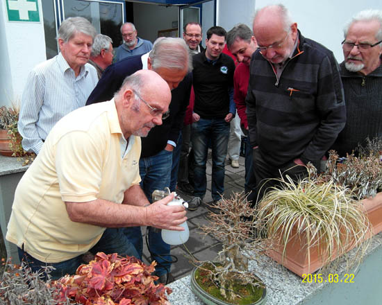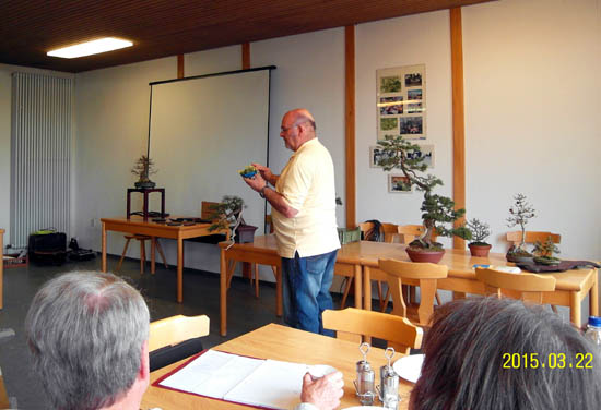 Frühjahr Thema: Vorbereitung der Bonsai auf Ausstellungen und deren richtige Präsentation. Wir durften im Botanischen Garten in Augsburg über 30 AK Mitglieder aus vielen Teilen Bayerns begrüssen. Am Vormittag gab es von Hans Kastner einen Vortrag über Auswahl der Schale, deren Reinigung und Tipps zur Schonung der Präsentationstische. Danach ging es um die Gestaltung der Erdoberfläche, danach um die Reinigung des Stammes. Abgeschlossen wurde der Vortrag mit der Auswahl der Tische, Beistellpflanzen und Rollbilder. Nachmittags ging es dann an die Praxis. Anhand der mitgebrachten Bäume, Beisteller und Tische wurde verschiedene Präsentationen und deren Wirkung durchgespielt. Schauen wir mal, wie wir das Gelernte bei den Bayer. Bonsaitagen im Hebst umsetzen können. Wir danken Hans für den schönen informativen Tag. Klaus Klemmer |
